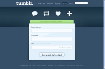 La principal característica de Tumblr es la rapidez: desde el proceso de registro, que completarás con tan sólo una dirección de correo, hasta el propio uso de la interfaz web, que te indica claramente los enlaces para que publiques el tipo de material deseado: texto, fotos, canciones, vídeos, fragmentos de chat o enlaces.